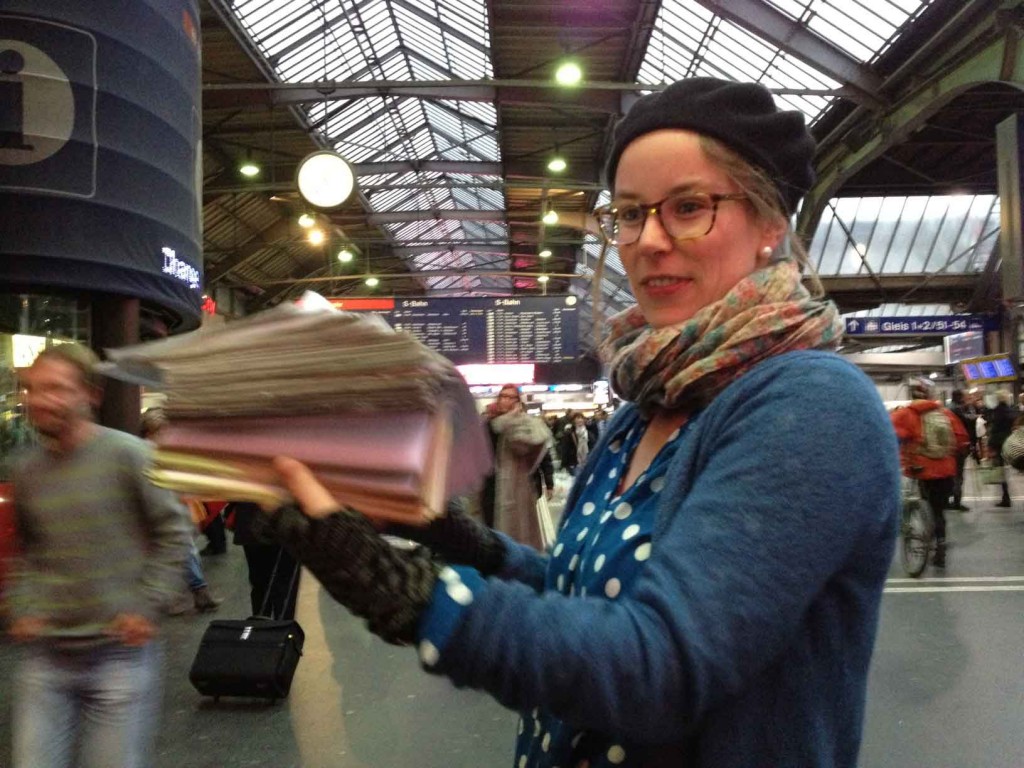 Level 2 der Generation Grundeinkommen geht so: Sammeln mit dem Initiativkomitee und zwar immer an einem anderen Ort mit GastgeberInnen aus der jeweiligen Stadt. Am 2. November fuhren wir von Basel nach Zürich und wurden dort ungeduldig erwartet. Die strahlende, würdevolle Helvetia schritt in unserer Mitte, von ihr ausschwärmend energievolle Sammler und Sammlerinnen. Nachdem am Morgen die ersten 300 Unterschriften gepflückt – ein gemeinsames z’Mittag im Gloria – und dann nochmals knapp 300 Bürgerstimmen bis zum abschliessenden z’Vieri geerntet wurden, konnten wir es aber nicht lassen auf der Rückfahrt im rappelvollen ICE nochmal ein bisschen weiter zu sammeln. Ein wunderbar (anstrengender) und erfüllender Erntetag. Für die Basler: Es ist auch erfrischend beim Sammeln mal mit anderen Dialekten konfrontiert zu werden.