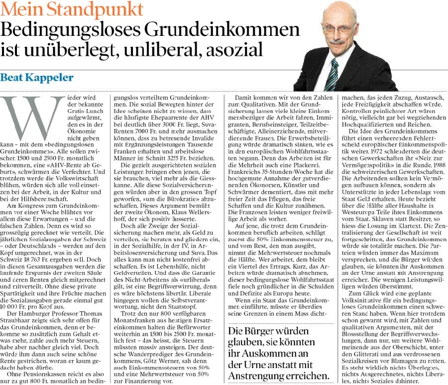 In der “NZZ am Sonntag” vom 27. März gibt Beat Kappeler, ehemaliger Sekretär des Schweizerischen Gewerkschaftsbundes und langjähriger Autor bei der Weltwoche, seinen Standpunkt zum bedingungslosen Grundeinkommen bekannt.