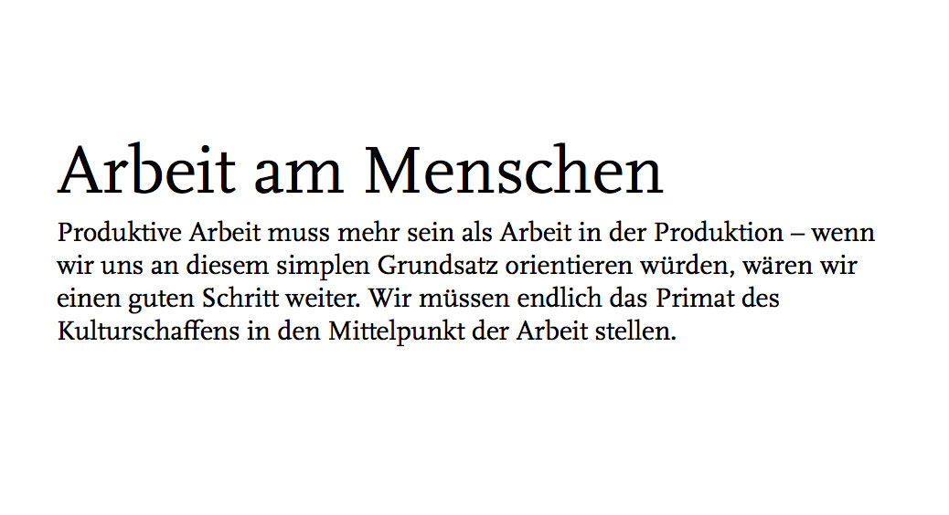 Eine Abkehr vom eingeengten Arbeitsbegriff liegt eigentlich auf der Hand. Stattdessen bleibt es beim fatalen Dogma, Erwerbsarbeitsplätze um jeden Preis erhalten zu wollen. Während uns bei der Veredelung von Naturgütern die Arbeit ausgeht, erleben wir einen immensen Mangel bei der Arbeit am Menschen und für den Menschen. Ein Blick in unsere Kindergärten, Schulen, Universitäten, Krankenhäuser, Pflegeheime und Hospize reicht aus, um die Versäumnisse zu erkennen, die wir uns in diesen Bereichen leisten. Die Zukunftsfähigkeit einer Gesellschaft entscheidet sich eben nicht in den Fertigungsstätten für Verbrauchs- und Gebrauchsgegenstände, sondern in den Bildungseinrichtungen und in allen Bereichen, in denen es um menschliche Zuwendung geht. Wenn wir in die Zukunftsfähigkeit unserer Gemeinschaft investieren wollen, dann dürfen wir nicht nur in die Ausbildung unserer Kinder investieren, sondern auch in deren Herzensbildung.