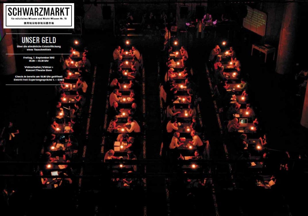 Der SCHWARZMARKT FÜR NÜTZLICHES WISSEN UND NICHT-WISSEN findet regelmässig seit 2005 statt, wird in jeder Stadt weiterentwickelt und thematisch adaptiert. Der Schwarzmarkt versteht sich sowohl als Schau- und Produktionsraum, in dem narrative Formate der Wissensvermittlung ausprobiert und präsentiert werden, als auch als transdisziplinäre Recherche über das Lernen und Verlernen von Wissen und Nicht-Wissen. Das Publikum, eher Klienten an diesem Abend, kann aus 26 Schlagwörtern auswählen: von A wie «Arbeit» bis Z wie «Zukunftsszenarien». An 18 Einzeltischen sitzen über den Abend insgesamt 57 Expertinnen & Experten und bieten einen Ausschnitt ihres Wissens an, der sich in 30 Minuten erzählen und erlernen lässt. So lexikalisiert der 15. SCHWARZMARKT live zentrale Aspekte des Geldes: Eines Mediums, das für den Einzelnen immer ungreifbarer wird, je mehr Bereiche unseres Lebens es bestimmt.