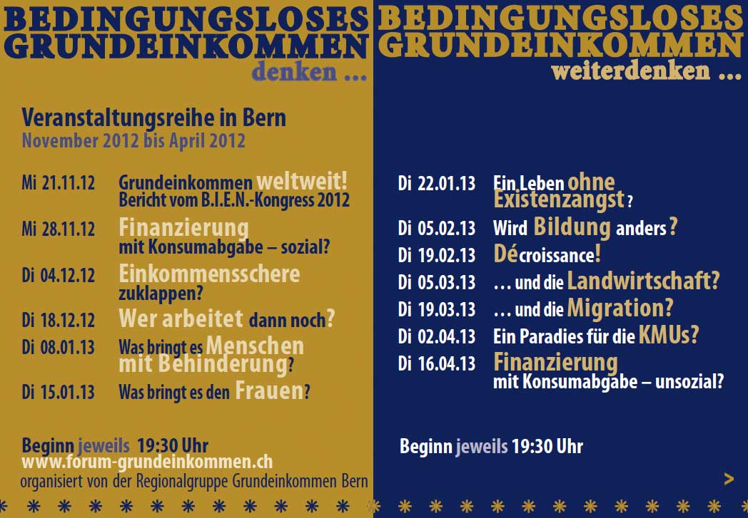 Zahlreiche Veranstaltungen zum Grundeinkommen in Bern, Zürich, Luzern, Genf, Weinfelden, Martigny und Rohrbas